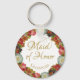 Den här roligtens nyckelring är designad som en gåva eller tjänst till maid of honor. Har en blommigt för vintage med gräns av Victorian ro och andra blommor på djupt rik i höstfärg, inklusive korall rosa, rött, orange och plommon. Texten är ett skript för elegant, guld, och det finns ett ställe för hennes namn. Snyggt sätt att tacka henne för att hon ingår i din bröllopsfest.