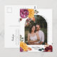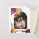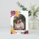 Detta höstbröllop tack-kort med ett fotografi av paret har djärka vattenfärgblommor i burgunderrött och bränt orange - perfekt för boho, rustika eller trädgårdsbröllop.