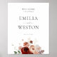Den här höstbohemska välkomstskylten för bröllop från Emilia-kollektionen har handritade blommor i höstfärgerna burgunderröd, rosa och guld. Anpassa den med dina uppgifter enkelt och snabbt. Tryck bara på knappen "Anpassa" för att ytterligare ändra och formatera stil och placering av texten.