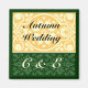 Bakgrundsfärgerna för detta konstverk är höstjaktgrönt och silkescrème med en unik vintagekonstdesign med blad och blommor. Det finns utrymme för Höstbröllop och brudens och brudgummens initialer. Använd denna mall för höstbröllop, hösttema-inbjudningar, klicka på Anpassa för att ändra teckensnitt eller färger, se designguider med mera.