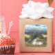 Vattenfärg på silke - manuell utrustning; vatten i sjö återspeglar kallet hösten himlar.Artist av Zolotareva.
