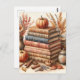 Skicka lite höstvärme med detta häpnadsväckande mysiga fallkort med ett vackert illustrerat likhetstid för vintage bokar staplat högt, accentuerat med pumpor, kanel, höst löv och rustiskt potteri. Perfekt för bok älskare, det mysiga mysteriet fläkt, och alla som högtidlighåller höstens charm med läskernokar och säsong-dekanter, fångar detta vykort det väsentliga i fallhygge. Perfekt för Thanksgiving hälsning, inbjudningar till höstfester, postorderbyten i snigel eller bara en säsong hej, blandar det här vykortet litterärt elegans med rustiska höstviber. Samlare av mysiga fallpapper, läsare och älskare av kottagecoretetik kommer att uppskatta dess nostalgiska charm. Det här vykortet är också utmärkt som ramkonst eller för säsong-journalistik. En tankfull gåva till bokmaskar, lärare och höstentusiaster.