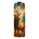 En majestäck med imponerande kantler står larm mitt i en livfull höstskog, omgiven av färgstarka fall i blad av rött, orange och guld. Tall evergreen träd lägger till djup i bakgrunden och skapar en bildkontur och en livlig naturlig inställning. Konsten fångar säsongens skönhet och det vilda livets storhet.
