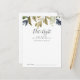 De här höstårens storslagna nattkort är perfekten för ett fallbröllop eller en möhippa. Den moderna, geologiska designen har marinblått, sage grönt och guld löv med sprit av mörk blått blommor. Anpassa korten med namn i bruden och brudgummen.