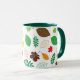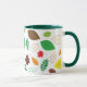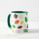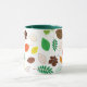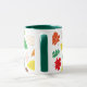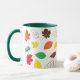 Kaffet mugg har en färgstark höst mönster med grönt, gult, orange och brunt löv på vit bakgrund.