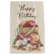 Späda möss med röda äpplen i bushel basket och höst löv på mjuk, texturerad bakgrund till burlap. Du kan redigera eller radera grattis på födelsedagen-text.