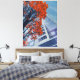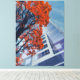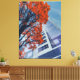 Bilden har en liten vinkel bild av ett modernt byggnad med ett träd i förgrunden. Träd har vibrerande orange löv, vilket tyder på att det är höst. Byggnaden är lång och har många fönster som återspeglar himmel. Himmel är en blåaktig mage med moln. Den allmänna stämningen är god och stadslivet, vilket fångar upp kontrasten mellan natur och arkitektur.