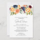 Denna fantastiska inbjudan till repetitionsmiddag visar en frodig akvarellblomsterarrangemang med gyllengula rosor, persikablommor, marinblå peonior och djup burgunderfärgade blommor som strömmar över toppen. Ren modern typografi passar vackert med den rika, juveltonade buketten mot en skarp vit bakgrund, med en koordinerad marinblå baksida. All formulering är helt anpassningsbar för att passa dina evenemangsuppgifter. Ett perfekt val för en höst- eller höstbröllopsrepetitionsmiddag.