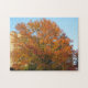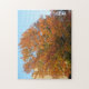 Färg från hösten vänder sig mot blå himmel och bleken som bygger bakom träd.