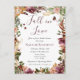 Detta är ett inbjudningskort för möhippan i rustik och elegant på ett vykort, med en blommigt av bohemisk autumnal vattenfärg och botaniskt gräns och texten "Fall in Kärlek". I paletten färg finns rik höst färger, t.ex. brännskador, bränd orange, terrakotta, djup grönt, bär och guld. Anpassa enkelt all text efter behov med hjälp av den angivna textmallen, inklusive att lägga till ett meddelande och avsändare adress på baksidan. Kontakta designern om du vill ha frågor om den här designen.