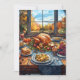 Bilden visar en vackert dukad Thanksgiving-middagsbord i en varm och mysig miljö. En stor ugnsstekt kalkon står som mittpunkt, omgiven av rätter såsom ugnsstekte potatisar, lagerpaj, vindruvor och små pumpor som dekoration. Bordet är täckt med en blå duk, och i bakgrunden syns en naturskön vy med höstfärger genom ett stort fönster, med livfulla orange, gula och röda träd under en delvis molnig himmel. Den övergripande stämningen känns festlig och inbjudande, perfekt för en familjesammankomst.