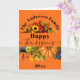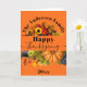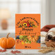 Det här anpassningsbara tackgivelsekortet har en livfull orange bakgrund som framhäver två rika skördescener. Den övre kanten visar solrosor och höstlöv som ramar in ditt familjenamn. Den nedre delen visar en orange pumpa, lila druvor och gröna äpplen. Frasen "Glad tackgivelse" är elegant skriven tvärs över mitten, vilket gör detta till en djärv, vacker hösthälsning.