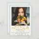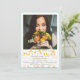 En dimmig grön-grå bakgrund är skiktad med en vit panel med trasig kant som är dekorerad med små gyllene blad och har en stor fönsterruta för foto. Lämplig för både könen och alla åldrar. Kortet är lätt att anpassa med din egen text, teckensnitt, teckensnittsfärg, pappersform och val av sex papperssorter.