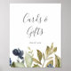 Denna höst grönska kort och present skylt är perfekt för en höstbröllop eller bröllopsfest. Den moderna rustika designen har marinblå, salvia grön och guld blad med kvistar av mörkblå blommor. Textraden längst ner på skylten kan anpassas med datumet, brudens och brudgummens namn eller ett kort meddelande som "Tack". Denna skylt kan användas för ett bröllop eller någon annan tillställning eller fest.