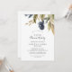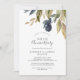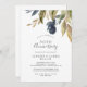Denna höstgrönska 50-års bröllopsdagsinbjudan är perfekt för en höstlig jubileumsfest. Den moderna rustika designen har marinblå, salvia grön och gyllene blad med kvistar av mörkblå blommor.