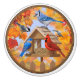 En blåfågel, blå jay, kyckling, nuthatch och kardinal samlas vid en höstmatare. Artwork skapades från en originalmålning av naturkonstnären Crista S. Forest.