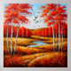 Höstlandsscen med livfulla röda och orangea löv, en lugn damm och flygande fåglar som frammanar känslor av stillhet och naturlig skönhet under den livfulla höstsesongen.
