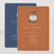Blandningen av jordnära terrakotta och marinblått skapar en varm och inbjudande atmosfär för ditt höstbröllop. Den rustika lövmonogrammet tillför en vacker bohemisk touch, och QR-koden är ett genialt sätt att göra RSVP:s smidiga. Det är den perfekta kombinationen av minimalistisk elegans och modern bekvämlighet.