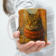 Sip i stil med "Autumn Whiskers" - en mysigt katt i en scarf omgiven av höst löv, perfekt på ett säsong-kaffe mugg.