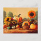 Pumpor av många färg omgivna av vackra solblommor med träd-klädd bakgrund.