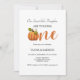 Ett kort för inbjudan att ringa trendig med en bränd orange-pumpa med höst löv. Enligt ordalydelsen "vår lilla pumpor vänder en."
