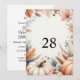 Minimalistisk kalligrafi text födelsedagsfest inbjudan med en vattenfärg bakgrund av höstblad och höstpumpor i neutrala höstfärger.