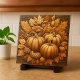 Denna keramiska plattan, perfekt för höstsäsongen, visar dekorativa pumpor på en falsk träbakgrund. Idealisk för säsongsbetonade hantverk eller som en backsplash, denna plattan frammanar en mysig och varm atmosfär. "AI-genererad konst med designriktning av Susang6"