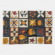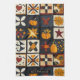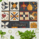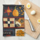 Den här kökshandduken har ett knivinspirerat lappverk mönster i ett rutnät av mörk och ljusa fyrkanter. Varje block lyfter fram unika motiv, från pumpor, höst löv och fåglar till geometrisk piecing som stjärnor, pinhjul och schackbräde. Utgiven i varma fallskuggor av orange, rött, gult och brunt mot kontrasterande kräm och mörk blått bakgrunder, fångar den mysiga charmen av handgjord filtning. Perfekt för jordskredsdécor, säsongshantverkare och primitiva konstentusiaster som kärlek hösten stil.