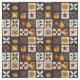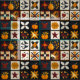 Den här väven har ett kortsiktigt lapptäcke mönster i ett rutnät av mörk och ljusa fyrkanter. Varje block lyfter fram unika motiv, från pumpor, höst löv och fåglar till geometrisk piecing som stjärnor, pinhjul och schackbräde. Utgiven i varma fallskuggor av orange, rött, gult och brunt mot kontrasterande kräm och mörk blått bakgrunder, fångar den mysiga charmen av handgjord filtning. Perfekt för jordskredsdécor, säsongshantverkare och primitiva konstentusiaster som kärlek hösten stil.