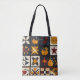 Den här väskan har ett kortfattat lapptäcke mönster som är placerat i ett rutnät med mörk och ljusa fyrkanter. Varje block lyfter fram unika motiv, från pumpor, höst löv och fåglar till geometrisk piecing som stjärnor, pinhjul och schackbräde. Utgiven i varma fallskuggor av orange, rött, gult och brunt mot kontrasterande kräm och mörk blått bakgrunder, fångar den mysiga charmen av handgjord filtning. Perfekt för jordskredsdécor, säsongshantverkare och primitiva konstentusiaster som kärlek hösten stil.