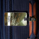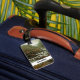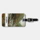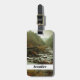 Ett bagagemärke med naturfotografi. Moody och vackert landskap. En avskärmad stenbro bredvid en livlig flod med skog och berg som omger området.