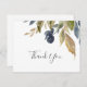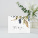 Den här höstgröna tacksändningskortet är perfekt för en höstbröllop. Den moderna rustika designen har marinblå, salvia gröna och gyllene blad med kvistar av mörkblå blommor. Personifiera baksidan av kortet med era namn och ett tackmeddelande. Alternativt kan ni lämna avsnittet för tackmeddelandemallen tomt för att handskriva en personlig hälsning på varje kort efter att de har anlänt. Dessa kort kan användas för ett bröllop, brudshow eller någon speciell tillställning.