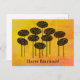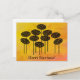 Glad födelsedag mot en hösthimmel fylld med träsnittsträd.