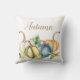Vackra vattenfärgspumpor i blå nyans, grönt, orange och vitt finns på kudden. Du kan anpassa hösten i ord som finns på båda sidor om kudden. Önska gästerna och familjen för fall och Thanksgiving med den här vattenfärgspumpkudden.
