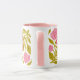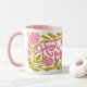 This is a vibrant and floral "Hot Momma" Mother's Day Mug features a wrap-around design with a bold, hand-painted writing, leaves and flowers. This mug is covered in a lush pattern of bright carnations and green foliage.