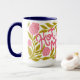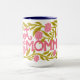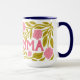 This is a vibrant and floral "Hot Momma" Mother's Day Mug features a wrap-around design with a bold, hand-painted writing, leaves and flowers. This mug is covered in a lush pattern of bright carnations and green foliage.