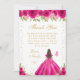 This elegant and glamorous birthday thank you card features a beautiful princess with brunette hair and fair skin in a hot pink ball gown. The text combines handwritten script and modern sans serif fonts for a classy and sophisticated look. The floral arrangements, butterflies and gold confetti create the perfect blend of rustic and chic.