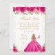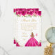 This elegant and glamorous birthday thank you card features a beautiful princess with blonde hair and fair skin in a hot pink ball gown. The text combines handwritten script and modern sans serif fonts for a classy and sophisticated look. The floral arrangements, butterflies and gold confetti create the perfect blend of rustic and chic.