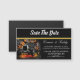 Kortet hot rod Bröllop spara datum har en orange som brinner ut och runt en gammal bil. Vid grund till mitten och en svart bakgrund med ställe för att lägga hela texten från inbjudan.