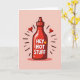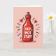 This cute card features a hot sauce bottle in bold red on a soft pink background. Simple shading gives the bottle a slightly 3D look. On the label, large white letters read “HEY HOT STUFF,” with a small flame underneath.