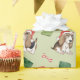 Cute Beagle med ben från candy cane, presenter och en julhatt mot ljust grönt bakgrund.