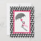 En inbjudan till babydusch med en svart och vit bakgrund och ett skrynkcenter som beskrivs i shock rosa på framsidan och baksidan. Främre funktioner som illustrerar ett högljudda paraply med rosa på handtaget. Text "Babyskon" hänger från handtag. Anpassa motsatt sida med information om tillfälle.