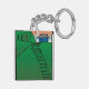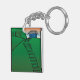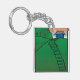 Ett blått hus sitta vid en grönt backe. Den här designen ser ut att vara effektiv i den här nyckelkedjan