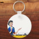 Lustigt med en hemmafru som stolt visar sin tvättmaskin och torktumlare. Ljus retro färg.