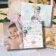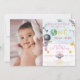 Baby födelsedag med astronaut, raketfraktaser, jord och stjärnor på mörkens rosa bakgrund. Vänd våra söta flickor inbjudan om att visa en samordnande skjutstjärna tillbaka. Besök vår butik för hela linjen, inklusive matchande raffle- och bok-kort.