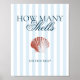 This elegant, downloadable 'How many shells do you sea?' sign features a vintage inspired, red drawn illustration of a seashell on a soft blue striped background.