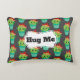 En accentkudde med texten: Hug Me, skriven i finare ram. Designad med ett upprepande mönster. En söt illustration av en plump round cactus med stort kawaii ögon, leende och med röd sombrero. Stå i en blomkruka. Bakgrunden är en svart bild av kontrollpanelen.