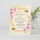 Elegant, roligt inbjudningskort för möhippan. Gult, vit bakgrund med en bikaka mönster. Med faux guld geometric ram. Dekoreras med rosa tropiska blommigtar blommor, hibiscus och lycklig humla. Med texten: Möhippan och namn på den brud som ska finnas på framsidan skriven med ett modernt handskript i stil. Black brev. Tillbaka: gult vit bikaka mönster.