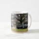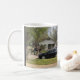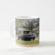 Ett kaffe mugg med ett foto av tillsatta lagar fordon.