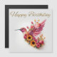 En flygande hummerfågel täckt av rosa solblommor, alleys och tulpaner Grattis på födelsedagen i guld-skript